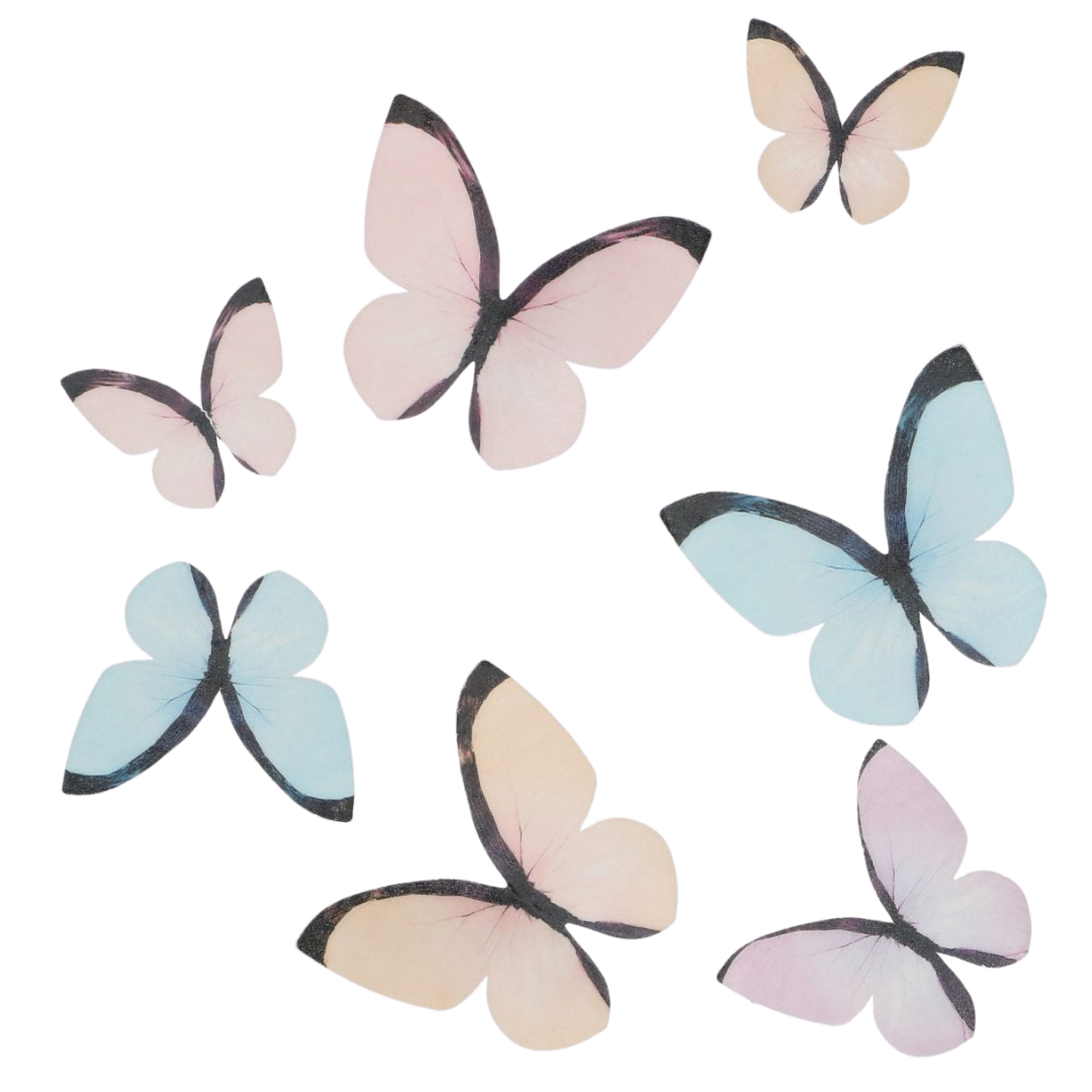 S kompletom Wilton jedilnih oblatnih dekoracij Metulji – pastelni (8 kos) dodajte svojim sladicam nežen in igriv pridih. Užitni oblatni metulji v mehkih pastelnih odtenkih vključujejo večje in manjše motive, ki omogočajo dinamično dekoracijo tort, mafinov ali drugih slaščic.